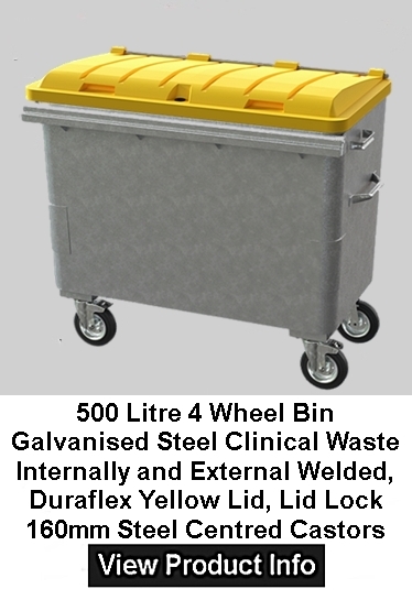 Standard Build: 500 Litres Galvanised. Recycling Bin Fitted with High Dome Recycling Flap Lid Suitable For Recycling Paper and Plastics With Internally Welded Seams, Welded On Comb Bar, EN840 compliant, Internally seam welded Hot dip galvanised body Welded comb bar, X 4 160mm Steel Centred Bolt On Castors For Easy Replacement, X 2 Foot Operated Standard Side Braked Castors X 2 Swivel Rear Castors Fitted with Black Duraflex Back Trade Lid, Lock and Base Drain Plug. Prices from: £470.00 Excluding VAT. 500 L will fit through any standard-width doorway. (12 Month Warranty) Delivery Time 2-4 Working Weeks