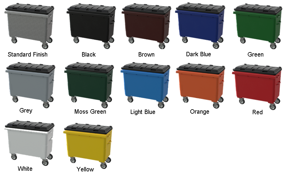 4 Lid OPtions & apertures, Duraflex Trade Lid, High Dome 2 Aperture Bottle Recycling Lid, High dome Recycling Flap Lid, Foot Operated Lid: Drain plug varieties Standard Lid Drain Plug, (Rodent Replant Drain Pug) Powder coated body colour options (See Colour Chart), Standard vinyl graphics, BESPOKE Options: Heavy duty version ( Suitable For Food Waste Recycling, Custom embossing External fork pockets X4 200mm or Heavy Duty High Speed 160mm or 200mm Directional towing castors, Towing Eye Towing Hitch, Bespoke vinyl graphics, Hands Free Foot Operated Duraflex Back Lid Opening.