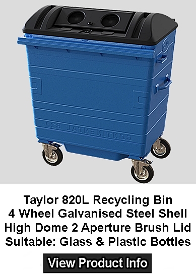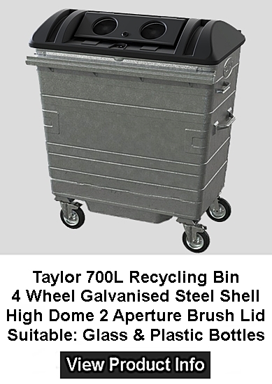 Standard Build: Galvanised. Recycling Bin Fitted with High Dome Recycling Flap Lid Suitable For Recycling Paper and Plastics With Internally Welded Seams, Welded On Comb Bar, EN840 compliant, Internally seam welded Hot dip galvanised body Welded comb bar, X 4 160mm / 200mm Steel Centred Bolt On Castors For Easy Replacement, X 2 Foot Operated Standard Side Braked Castors X 2 Swivel Rear Castors Fitted with Black Duraflex Back Trade Lid, Lock and Base Drain Plug.