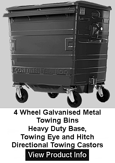 Bin Towing Containers provide a safe, practical answer to all towing requirements. Any container which is to be towed should be fitted with heavy-duty Power Towing castors or two swivel castors complete with directional locks, at one end of the container, and no more than 4 containers are towed at any one time.