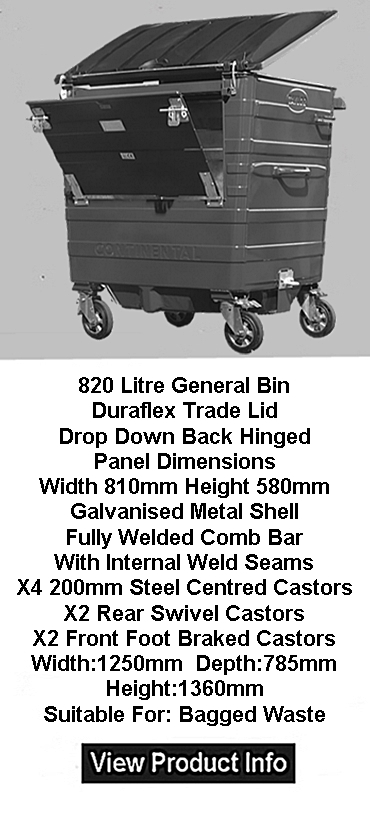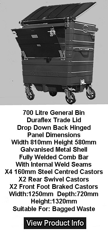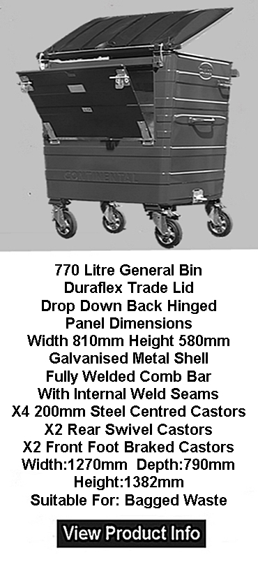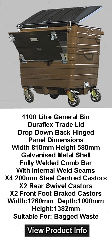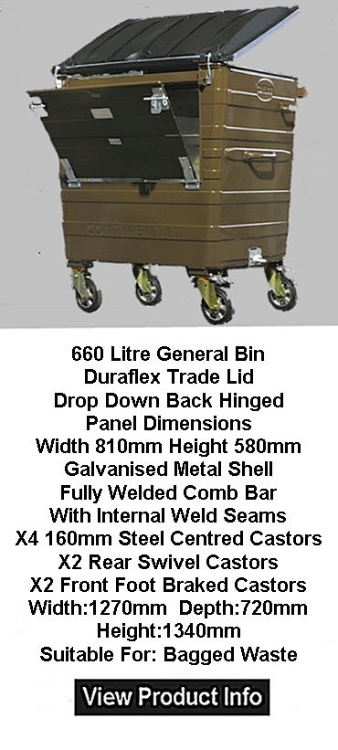 Standard Build: 1100 Litre 4 Wheel Galvanised Metal Drop Hinged Back Panel: Fitted with Duraflex Black Trade Lid and Lid Lock- X 4 200 mm Bolt on Steel Centred Castors For Easy Replacement, 2 Front Braked Foot (12 Months Warranty)