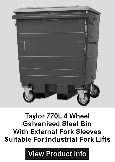 Taylor Mk2 770L: 770 Litre Trade Bin, Galvanised Steel Shell, Internally seams welded. The comb lifting bar is manufactured from 2.0mm** thick galvanised steel and features 7 gussets for additional strength. DuraFlex Trade Lid is manufactured from high-grade UV-stabilised polyethylene. With Standard Flat Trade Lid, Taylor 200mm Steel Centred castors, 2x Back / Rear swivel Castors, 2 x Foot operated braked castors, Danish Side Handles for easy Manoeuvrability in confined bin storage areas